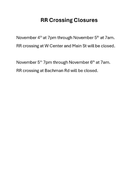 RR Crossing Closures November 4 th at 7pm through November 5 th at 7am. RR crossing at W Center and Main St will be closed. November 5 th 7pm through November 6 th . . .